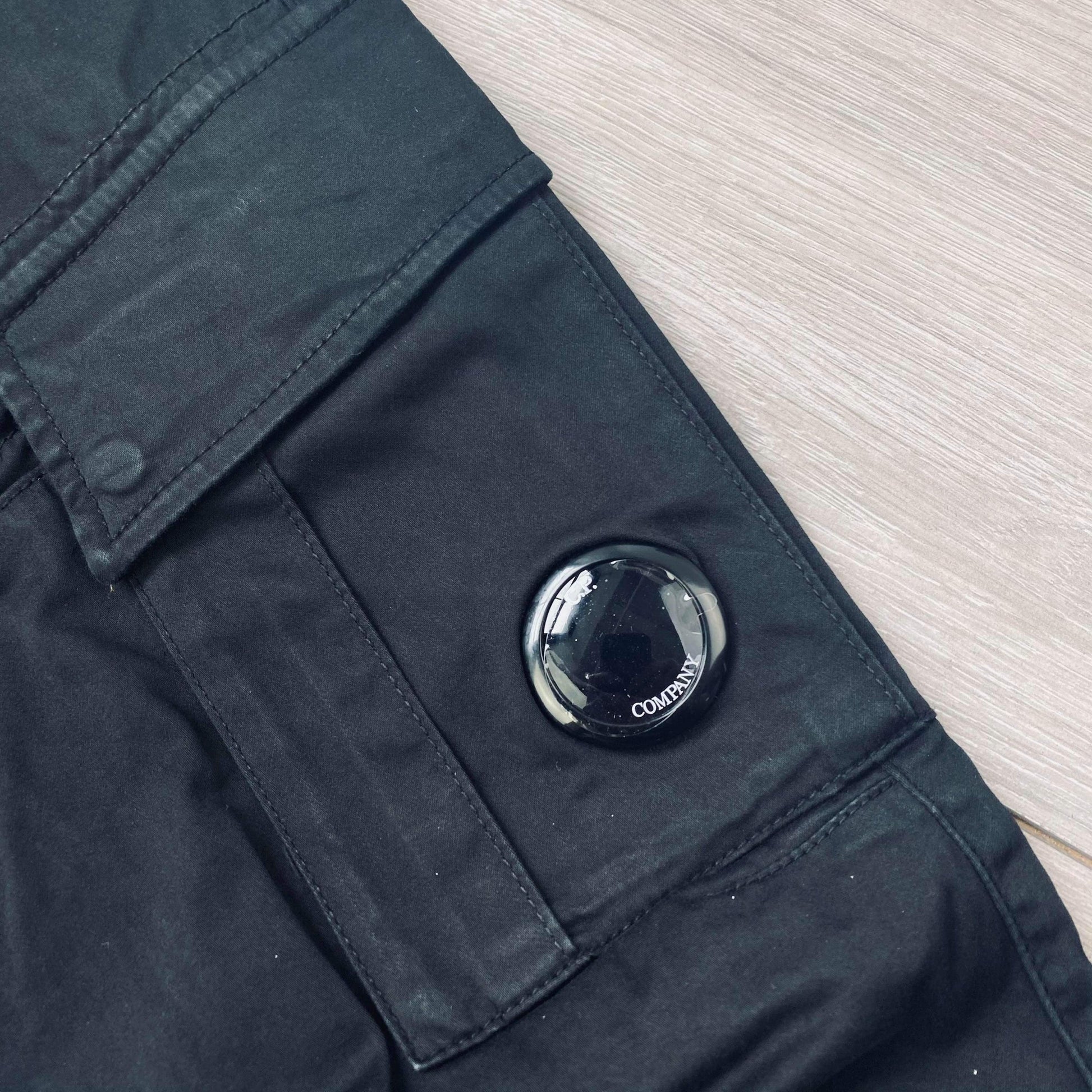 A functional everyday essential from CP Company, the Black Stretch Sateen Cargo Lens Pants combine ergonomic tailoring with signature utility detailing.