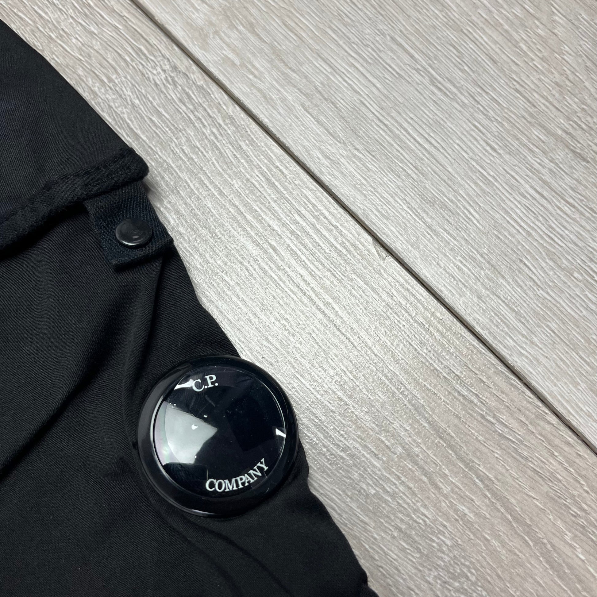 Black CP Company cargo trousers with double bellows pocket and lens