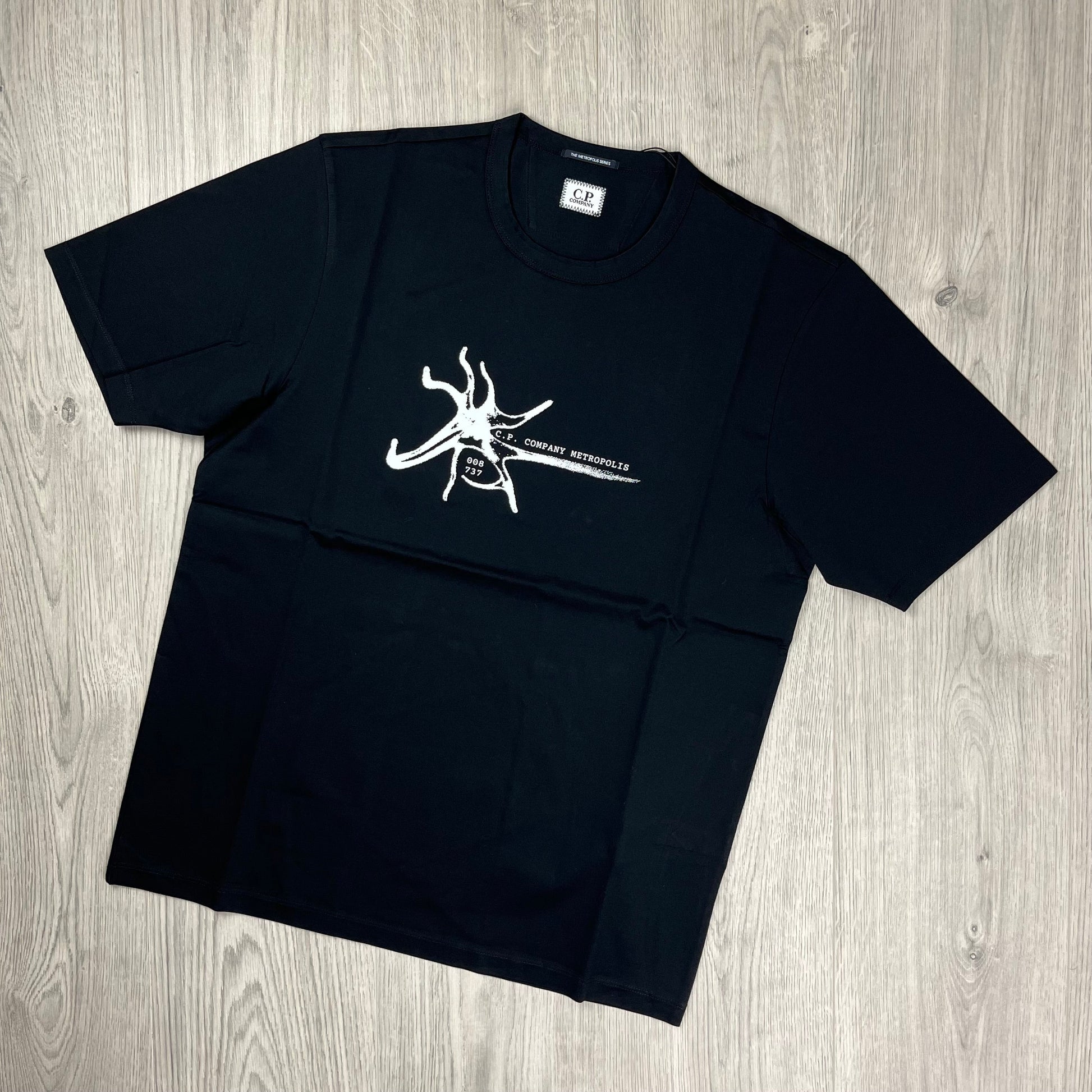 Black CP Company Metropolis T-shirt with white printed logo across the chest