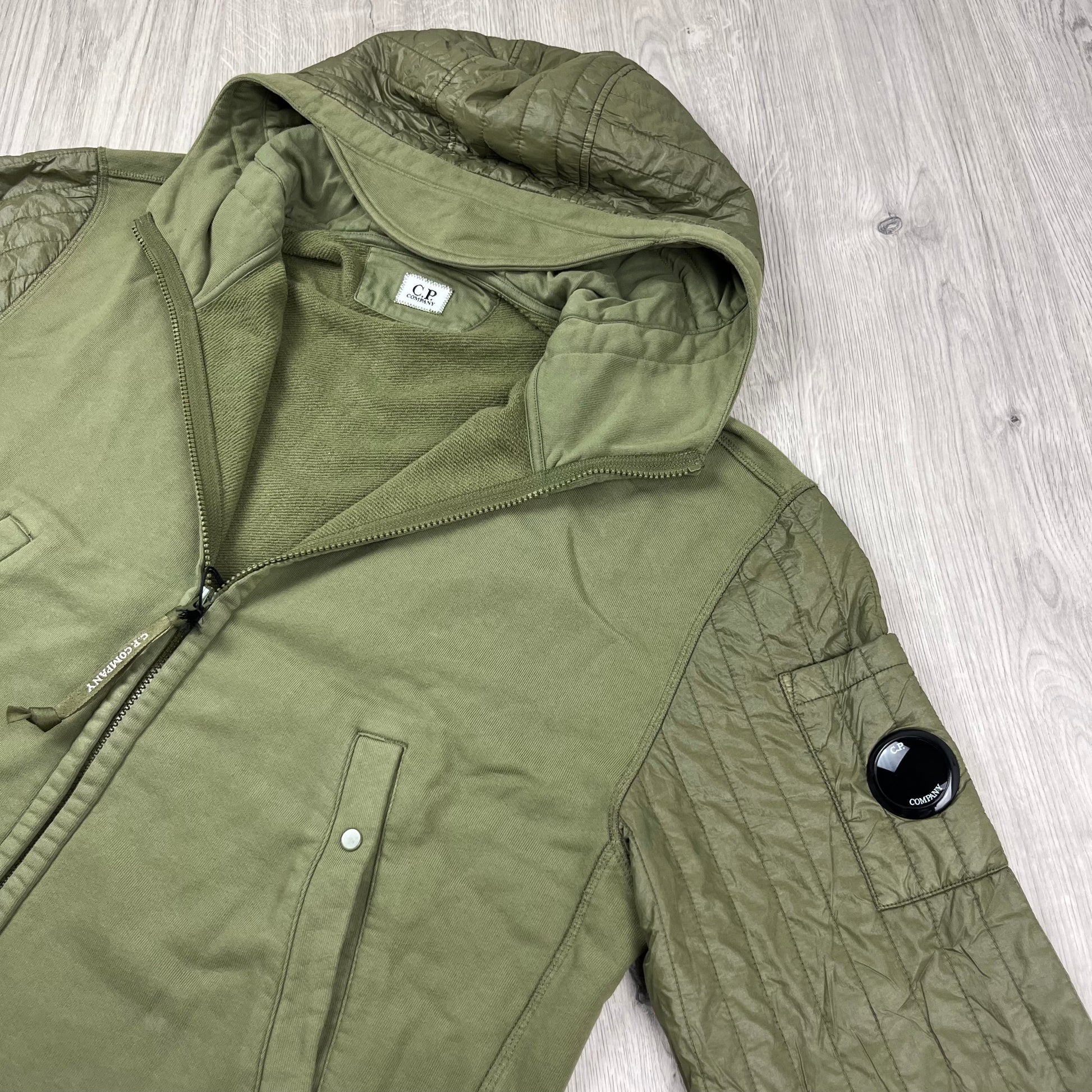 Capers khaki CP Company Diagonal Raised Fleece zip hoodie with liner sleeves and sleeve lens
