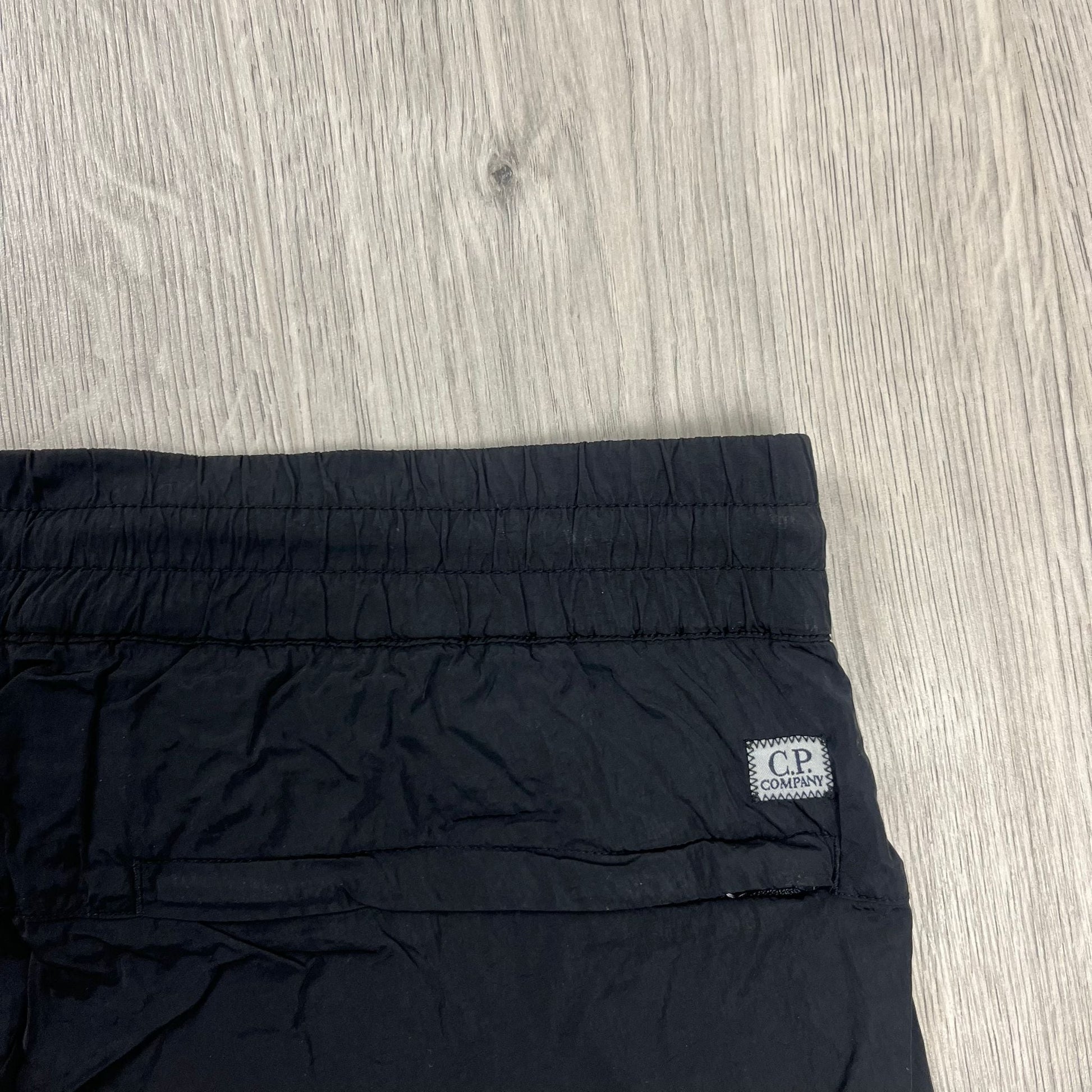 Black CP Company chrome-R track pants with lens detail on a cargo pocket